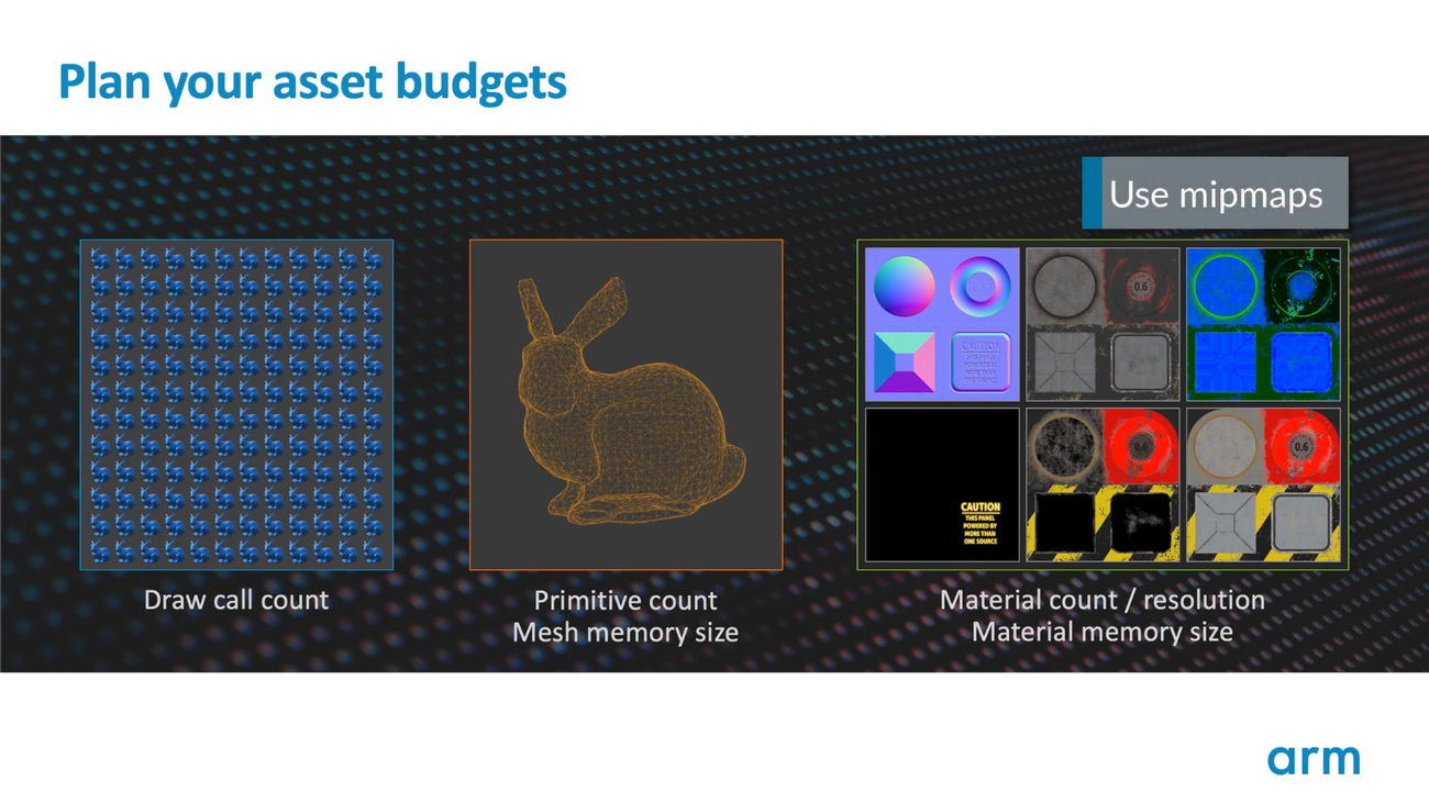 마지막으로, 머터리얼 세트가 있다. 이것은 배포 시에, 그리고 메모리 안에서의 텍스처 데이터를 관리하는 것을 주로 의미한다. 필요 텍스처 저장 공간은 아주 빠르게 커질 수 있다. 따라서, 머터리얼 갯수, 해상도, 그리고 오프라인에서의 압축을 사용하는 것이 여기에서는 모두 중요하다. 런타임에서의 효율을 위해 3D 오브젝트에서는 거의 항상 mipmap이 필요할 것이다. 그것이 메모리 공간을 약간 더 차지하지만 말이다.