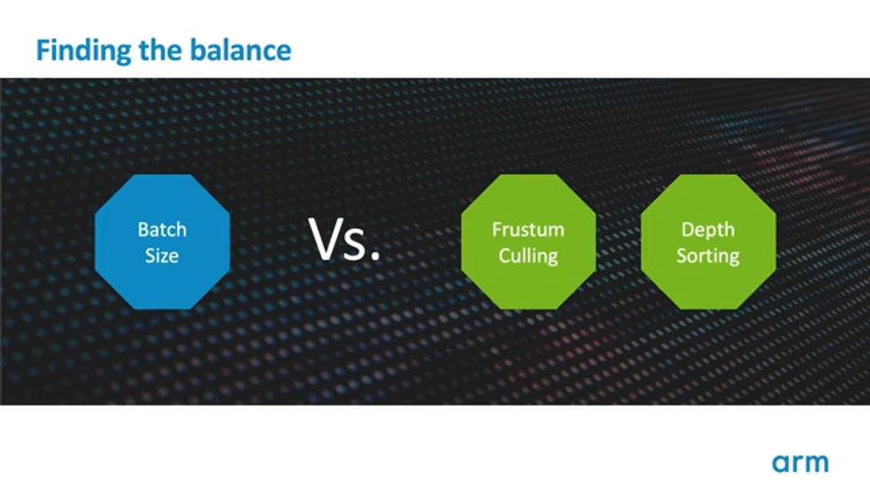 일반적으로 많이 하는 질문 중 하나는, 이런 종류의 depth sorting이, 대부분의 GPU - Mali를 포함해서 - 들이 어떤 형태의 hidden surface removal 을 수행함애도 불구하고, 여전히 할 가치가 있는지이다. 여기에 대한 답은 그렇다 - 여전히 할 가치가 있다 이다. hidden surface removal 은 완벽하지 않고, Early-ZS만큼 효율적으로 특정 상황에 대응할 수 없다. 저비용의 싼 sorting을 수행하는 것은 거의 항상 좋다. 완벽할 필요가 없고, Early ZS test를 최대한 활용하기 위한 것이다.
