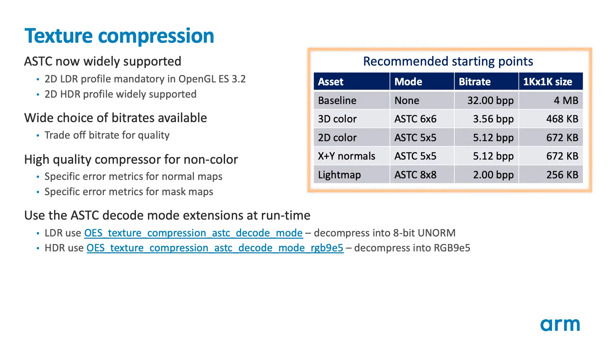 - 압축된 텍스처를 사용할 때는, 새로운 타이틀을 출시할 때 ASTC를 기본값으로 사용하고, ASTC를 지원하지 않을 경우 fallback으로 ETC2 것을 권장한다. 2012년부터 ASTC 가 기기에 탑재되어 출시되고 있고, OpenGL ES3.2 에서는 필수가 되었다. 따라서, 2D LDR 프로필은 이제 모바일 기기에서 모두 지원된다. 그리고 많은 기기에서 2D HDR 프로파일도 지원한다. ASTC는 ETC2+EAC에 비해서 두 가지 큰 장점을 갖고 있다. 첫째로, ASTC는 훨씬 유연한 압축 포맷이다 - 같은 bitrate 에서 훨씬 더 나은 이미지 품질을 얻을 수 있다. 두 번째로, 다양한 bitrate 선택지를 제공해서, 사용자들이 텍스처 메모리 사용량과 bandwidth 소모를 아주 세밀하게 튜닝할 수 있도록 해 준다.반면, 미리 구워진 라이트맵들은 보통 low-frequency 텍스처들이기 때문에, 8x8 block 을 사용해 2bpp로 압축할 수 있다.기본적으로 sRGB Profile을 사용할 경우는 32bit이고, 나머지 경우는 64bit 이다.