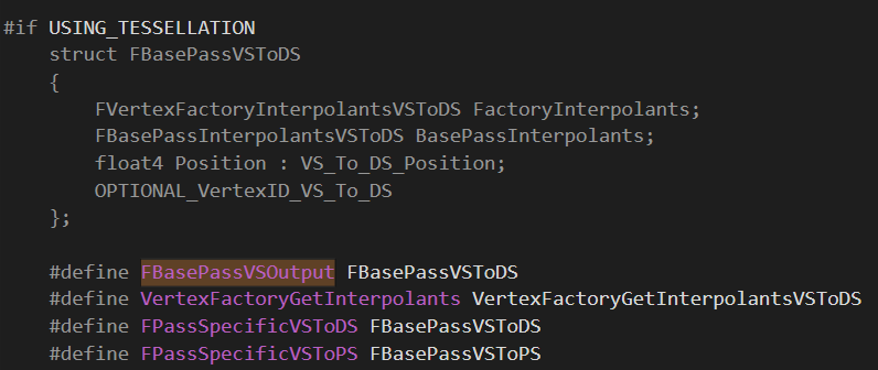 언리얼이 쓰는 또다른 트릭을 살펴보자. #define 문을 통해 FBasePassVSOutput 의 의미를 바꾸고 간단힌 FBasePassVSToPS 구조체로 심플하게 정의되거나, 테셀레이션을 위해 FBasePassVSToDS 로 정의될 수 있다. 두 구조체는 거의 비슷한 내용이지만, Domain Shader 버전은 몇 개의 변수를 추가한다.