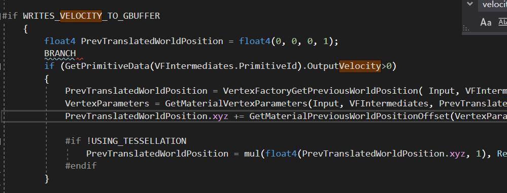 #IF_WRITES_VELOCITY_TO_GBUFFER 이라고 되어 있는 부분이 있다. 여기에서는 버텍스 단위로 이전 프레임과 현재 프레임간의 차이를 계산해 속도(VELOCITY)를 계산한다. 일단 계산된 다음에는 BasePassInterpolants 내의 변수에 값을 저장하지만, 자세히 들여다보면 그 변수의 선언을 같은 define문인 #IF_WRITES_VELOCITY_TO_GBUFFER 로 감싸놓은 것을 알 수 있다.