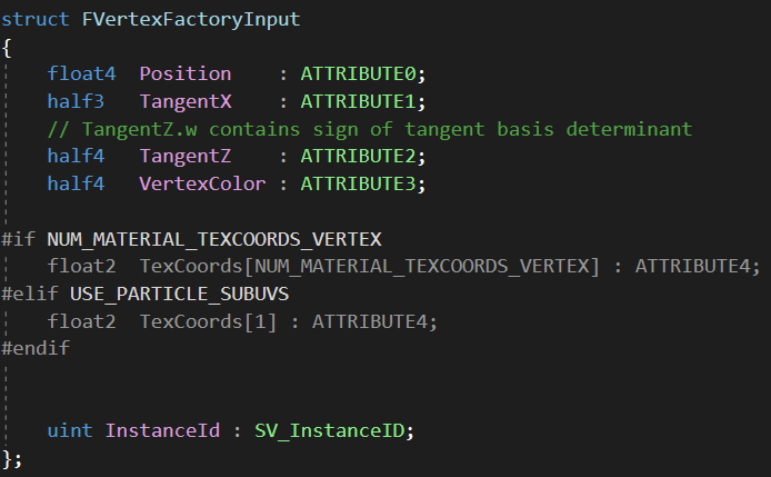 왜냐하면 모든 버텍스 팩토리들은, 적어도 베이스 패스 상에서는 같은 버텍스 셰이더를 공유하기 때문이다. 버텍스 팩토리들은 FVetexFactoryInput이라는 인풋 스트럭처를 사용한다.