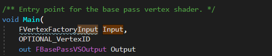 언리얼이 같은 버텍스 셰이더를 사용하지만 각 버텍스 팩토리에 대해서는 다른 코드를 포함하기 때문에, 언리얼은 FVertexFactoryInput 구조체를 각각의 버텍스 펙토리 내에서 재정의한다. 이 구조체는 GpuSkinVertexFactory.ush, LandScapeVertexFactory.ush, LocalVertexFactory.ush 그리고 몇 가지 다른 ush 에서 고유의 모습으로 재정의된다. 당연히 이 파일들을 모두 include할 수는 없을 것이다. - 대신 BasePassVertexCommon.ush가 VertexFactory.ush 를 인클루드한다. 이것은 셰이더가 컴파일 되었을 때 올바른 버텍스 팩토리에 셋팅되어, 엔진이 어느 FVertexFactoryInput implementation을 사용할 지를 알수 있도록 해준다. 앞에서 간단하게 살펴본 바와 같이, 버텍스 팩토리를 선언하는 데 사용되는 매크로에 셰이더 파일을 제공해야 하는데, 이것이 그 이유이다.